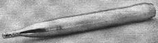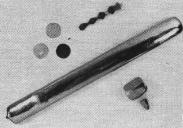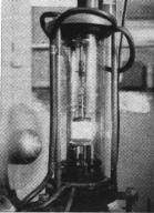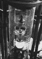 Man ser här det inre av den av kvartsglas uppbyggda klockan, som innehåller den nyss omnämnda uppvärmningsspiralen, som upphettar den i bildens mitt synliga degeln. I degeln erhålles smält högrenat germanium. Där ovanför ser man den växande kristallen, som långsamt dras uppåt under samtidig vridning. Fig. 6 ger en tydligare inblick i förloppet. Man ser här genom ett fönster i kvartsklockan den växande germaniumkristallen. När denna process är avslutad, har man en 140 mm lång germaniumkristall i form av en stav, som sedan kan utnyttjas för framställning av germaniumdioder och transistorer (se fig. 7). Utgångsmaterialet för den vidare bearbetningsprocessen är 0,4 mm tjocka germaniumplattor. Dessa erhålles genom att germaniumkristallen sågas i skivor med hjälp av en diamantsåg (fig. 8). |