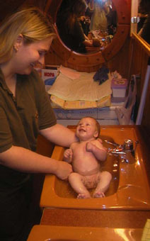 badar i mitt badrum. Han verkar faktiskt gilla det! Själv står jag ut men inte mer. Det är bättre att få bada i sjön. |