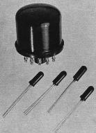 en utpräglad fotoeffekt. I fig. 10 visas i stark förstoring en germaniumplatta för en effekttransistor. Hur små och behändiga skikttransistorerna är framgår av fotot i fig. 1, som visar fyra skikttransistorer i jämförelse med ett äldre stålrör, Telefunken EF14. |
