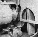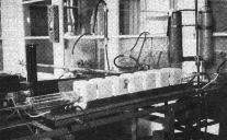 Man ser här det inre av den av kvartsglas uppbyggda klockan, som innehåller den nyss omnämnda uppvärmningsspiralen, som upphettar den i bildens mitt synliga degeln. I degeln erhålles smält högrenat germanium. Där ovanför ser man den växande kristallen, som långsamt dras uppåt under samtidig vridning. Fig. 6 ger en tydligare inblick i förloppet. Man ser här genom ett fönster i kvartsklockan den växande germaniumkristallen. När denna process är avslutad, har man en 140 mm lång germaniumkristall i form av en stav, som sedan kan utnyttjas för framställning av germaniumdioder och transistorer (se fig. 7). Utgångsmaterialet för den vidare bearbetningsprocessen är 0,4 mm tjocka germaniumplattor. Dessa erhålles genom att germaniumkristallen sågas i skivor med hjälp av en diamantsåg (fig. 8). |