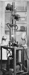 Fig. 4 visar den kompletta apparaturen för denna process. I det evakuerade kvartshöljet, som synes ungefär i mitten på bilden, är innesluten en degel, som upphettas med en värmeslinga. I degeln anbringas det polykristallina germaniumet som därvid nedsmältes.I denna smälta neddoppas 'ympkristall', som under lämpliga betingelser kan växa till godtycklig storlek. Den växande enkristallen upplyftes ur smältan under samtidig vridning. Dessa rörelser bibringas genom de överst på bilden synliga elektromotorerna. Två fläktar åstadkommer erforderlig avkylning av kvartsklockan. Fig. 5 visar närbild av den övre delen av apparaturen. |