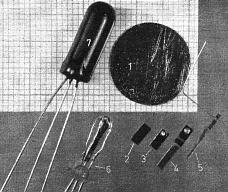 Fig. 9 visar sista etappen vid framställningsproceduren. Den sågade germaniumskivan av 0,4 mm:s tjocklek (1) slipas ner till 0,2 mm:s tjocklek. Ur denna skär man sedan ut rektangulära små plattor av storleken 4x1,5 mm och etsar ytan ner till en tjocklek av 0,14 mm (2). Därefter anbringas två runda skivor av indium på germaniumplattan från båda sidor: det bildar då ett spärrskikt med en tjocklek av några få um (3). Efter det att en baselektrod av nickel lötts på (4) lödes silvertrådar på indiumskivorna (5). Det hela sättes på en stödskiva (6) och smältes in i ett hölje så att transistorn blir skyddad för luft och fuktighet.