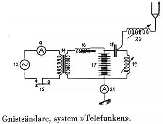 | Denna gick ut på att bryta gnistkretsen i samma ögonblick, som den lämnat sin energi till antennkretsen. Brytningen skedde genom att använda en kyld gniststräcka. Gnistan slocknade, då energien i gnistkretsen var förbrukad. Härigenom kunde antennkretsen svänga med betydligt mindre dämpning än tidigare. Genom att svängningarna startade med regelbundna tidsmellanrum, 500 eller 1000 gånger per sek., fick man en ren musikalisk ton i mottagaren. Denna stationstyp användes ännu idag med i stort sett samma utförande som nödsändare på handelsflottans fartyg. Äran av att ha konstruerat 'sändaren med tonande gnistor' ('tönende Funken') delar Wien med den svenske marin-ingenjören Rendahl, som under åren 1900..1909 var anställd vid AEG. Greve Arco gjorde även egna konstruktioner. | ![]() |