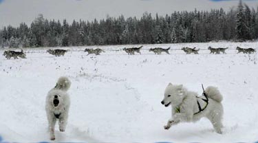 Samojederna tränas för kortare distanser. Khatanga och Yelena är påselade och väntar på att få jobba...